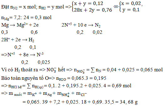 Cho 7,2 gam bột Mg tan hết trong dung dịch hỗn hợp HCl (dư) và KNO3, thu được dung dịch X chứa m gam muối và 2,688 lít khí Y (đktc) gồm N2 và H2 có khối lượng 0,76 gam. Giá trị của m là ?