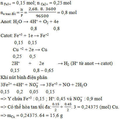 Điện phân dung dịch chứa 0,15 mol Fe(NO3)3; 0,25 mol Cu(NO3)2 với điện cực trơ cường độ dòng điện 2,68A trong 8 giờ thu được dung dịch X. Lấy dung dịch X ra khỏi bình điện phân và để yên cho đến khi phản ứng kết thúc thu được dung dịch Y và có khí NO thoát ra. Dung dịch Y có thể hòa tan tối đa bao nhiêu gam Cu ? (biết NO là sản phẩm khử duy nhất của các phản ứng trên).