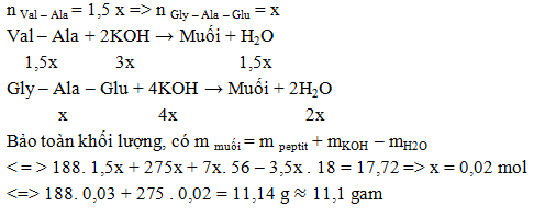 X là đipeptit Val – Ala, Y là tripeptit Gly – Ala – Glu. Đun nóng m gam hỗn hợp X và Y có tỉ lệ
