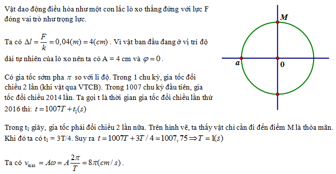 Một con lắc lò xo gồm lò xo có độ cứng k = 100N/m, một đầu cố định một đầu gắn vật nhỏ m có thể chuyển động không ma sát trên mặt phẳng nằm ngang. Vật đang nằm yên ở vị trí cân bằng, thì người ta tác dụng lên vật một lực không đổi, có độ lớn F = 4N, hướng theo trục của lò xo. Kể từ lúc tác dụng lực F, thời điểm mà gia tốc đổi chiều lần thứ 2016 là 1007,75s. Tốc độ cực đại của vật là: