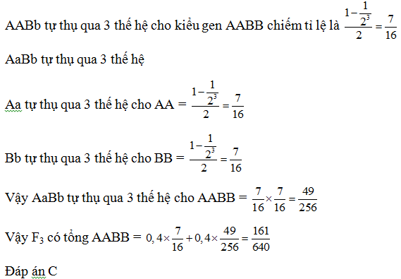 Cho cấu trúc di truyền quần thể như sau: 0,4AABb : 0,4AaBb : 0,2aabb. Người ta tiến hành cho quần thể tự thụ phấn bắt buộc qua 3 thế hệ. Tỉ lệ cơ thể mang hai cặp gen đồng hợp trội là: