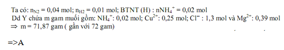 Nung nóng hỗn hợp chất rắn A gồm a mol Mg và 0,25 mol Cu(NO3)2, sau một thời gian thu được chất rắn X và 0,45 mol hỗn hợp khí NO2 và O2. X tan hoàn toàn trong dung dịch chứa vừa đủ 1,3 mol HCl, thu được dung dịch Y chứa m gam hỗn hợp muối clorua, và thoát ra 0,05 mol hỗn hợp khí Z gồm N2 và H2, tỉ khối của Z so với H2 là 11,4. Giá trị m gần nhất với: