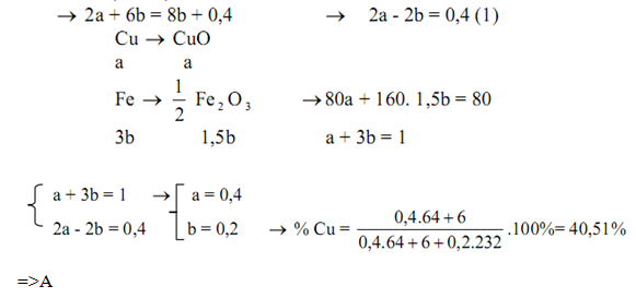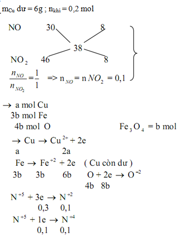 Cho m gam hỗn hợp X gồm Fe3O4 và Cu vào dung dịch HNO3, thu được dung dịch Y, có 4,48 lít (đktc) hỗn hợp Z gồm NO và NO2 (có tỉ khối so với hiđro bằng 19) thoát ra và còn lại 6 gam chất rắn không tan. Cho dung dịch KOH dư vào dung dịch Y, lọc tách kết tủa và nung trong không khí đến khối lượng không đổi thu được 80 gam chất rắn. Thành phần phần trăm về khối lượng của Cu trong hỗn hợp X là