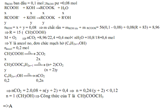 Hỗn hợp X gồm ancol đơn chức Y, axit hữu cơ đơn chức Z và este T tạo ra từ Y và Z. Cho m gam X tác dụng với 200 ml dung dịch KOH 0,5M (dư 25% so với lượng phản ứng) đun nóng, sau khi kết thúc các phản ứng thu được dung dịch M. Cô cạn M thu được 8,96 gam chất rắn khan. Đốt cháy hoàn toàn m gam X trên bằng O2 lấy dư, thu được 8,96 lít CO2 (đktc) và 10,8 gam H2O. Công thức của T là