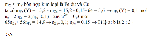 Cho 14,9 gam hỗn hợp X gồm Zn (a mol) và Fe (b mol) vào 300 ml dung dịch CuSO4 0,5M. Sau khi các phản ứng hoàn toàn, thu được dung dịch và 15,2 gam hỗn hợp kim loại Y. Tỉ lệ a: b là