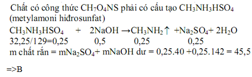 Cho 32,25 gam một muối có công thức phân tử CH7O4NS tác dụng hết với 750ml dung dịch NaOH 1M đun nóng thấy thoát ra chất khí làm xanh quỳ tím ẩm và thu được dung dịch X chỉ chứa các chất vô cơ. Cô cạn dung dịch X thu được bao nhiêu gam chất rắn khan?