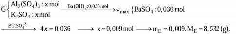 E là muối sunfat kép của nhôm và kali ngậm nước, được dùng trong ngành thuộc da, chất cầm màu trong công nghiệp nhuộm vải, chất làm trong nước,… Hòa tan hết m gam E vào nước được dd G, nhỏ từ từ dd Ba(OH)2 vào dd G thấy khi vừa dùng hết 0,2 lít dd Ba(OH)2 0,18M thì thu được kết tủa có khối lượng lớn nhất. Giá trị của m là: