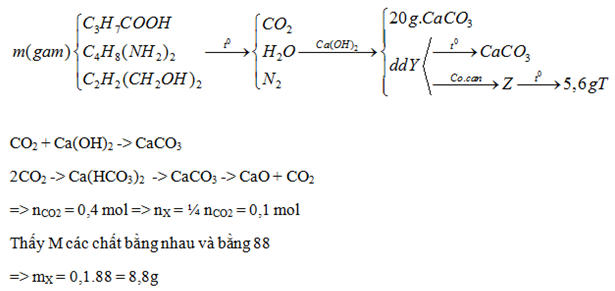 Hỗn hợp X gồm C3H7COOH, C4H8(NH2)2 và HO-CH2-CH = CH- CH2-OH. Đốt cháy hoàn toàn m gam hỗn hợp X , sản phẩm cháy hấp thụ hoàn toàn vào dung dịch Ca(OH)2 thấytạo ra 20 gam kết tủa và dung dịch Y. Đun nóng dung dịch Y thấy xuất hiện kết tủa. Cô cạn dung dịch Y rồi nung nóng chất rắn thu được đến khối lượng không đổi thu được 5,6 gam chất rắn .Giá trị của m là