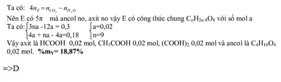 Hỗn hợp A gồm 3 axit cacboxylic no, hở X, Y, Z (MX < MY <MZ) và một ancol no, hở đa chức T (phân tử không có quá 4 nguyên tử C). Đốt cháy hoàn toàn m gam A thì tạo ra hỗn hợp CO2 và 3,24 gam H2O. Tiến hành este hóa hoàn toàn hỗn hợp A trong điều kiện thích hợp thì hỗn hợp sau phản ứng chỉ thu được 1 este E đa chức và H2O. Để đốt cháy hoàn toàn lương E sinh ra cần 3,36 lít O2 thu được hỗn hợp CO2 và H2O thỏa mãn . Thành phần % về khối lượng của Y trong hỗn hợp A là?
