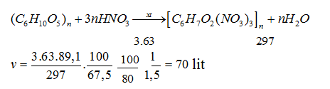 Thể tích dung dịch HNO3 67,5% (khối lượng riêng là 1,5 g/ml) cần dùng để tác dụng với xenlulozơ tạo thành 89,1 kg xenlulozơ trinitrat là (biết lượng HNO3 bị hao hụt là 20%)