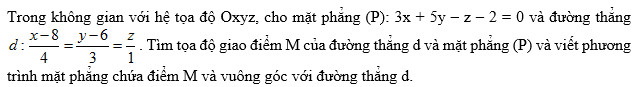 + M ∈ d ⇒ M(8 + 4t; 6 + 3t; t). M ∈ (P) ⇒ 3(8 + 4t) + 5(6 + 3t) – t – 2 = 0 ⇒ t = –2 ⇒ M(0;0;–2)
