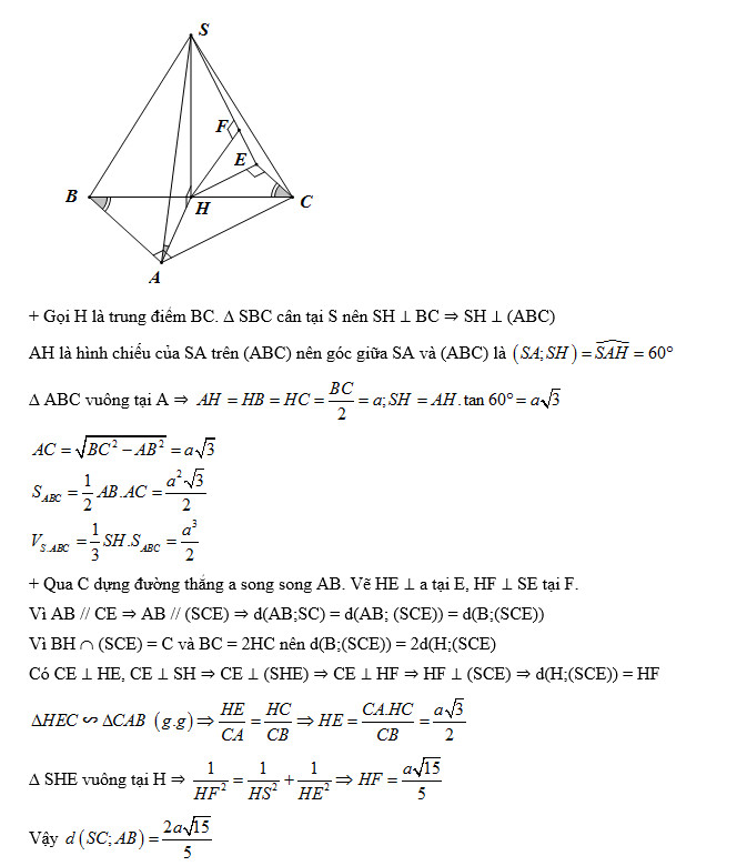 Cho hình chóp S.ABCD có đáy ABC là tam giác vuông tại A, AB = a, BC = 2a. Mặt bên SBC là tam giác cân tại S và mặt phẳng (SBC) vuông góc với mặt phẳng (ABC), góc giữa SA và mặt phẳng (ABC) bằng 600. Tính thể tích khối chóp S.ABC và khoảng cách giữa hai đường thẳng SC và AB theo a.