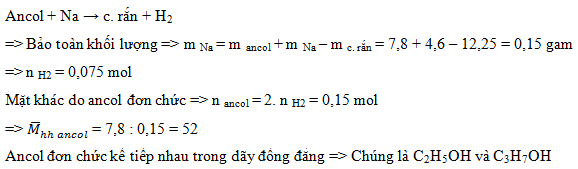 Cho 7,8 gam hỗn hợp hai ancol đơn chức, kế tiếp nhau trong dãy đồng đẳng tác dụng hết với 4,6