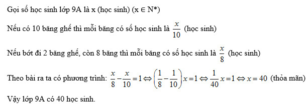 Một phòng học có 10 băng ghế. Học sinh của lớp 9A được sắp xếp chỗ ngồi đều nhau trên mỗi băng ghế. Nếu bớt đi 2 băng ghế, thì mỗi băng ghế phải bố trí thêm một học sinh ngồi nữa mới đảm bảo chỗ ngồi cho tất cả học sinh của lớp. Hỏi lớp 9A có bao nhiêu học sinh