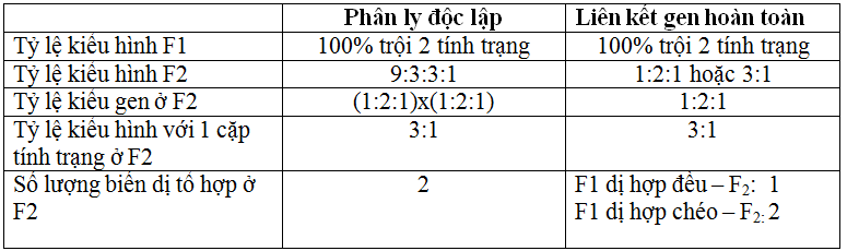 Trong trường hợp một gen quy định một tính trạng, tính trạng trội là trội hoàn toàn. Cho P thuần chủng, khác nhau 2 cặp tính trạng tương phản. Cho một số nhận định về điểm khác biệt giữa quy luật phân li độc lập với quy luật liên kết gen hoàn toàn như sau: