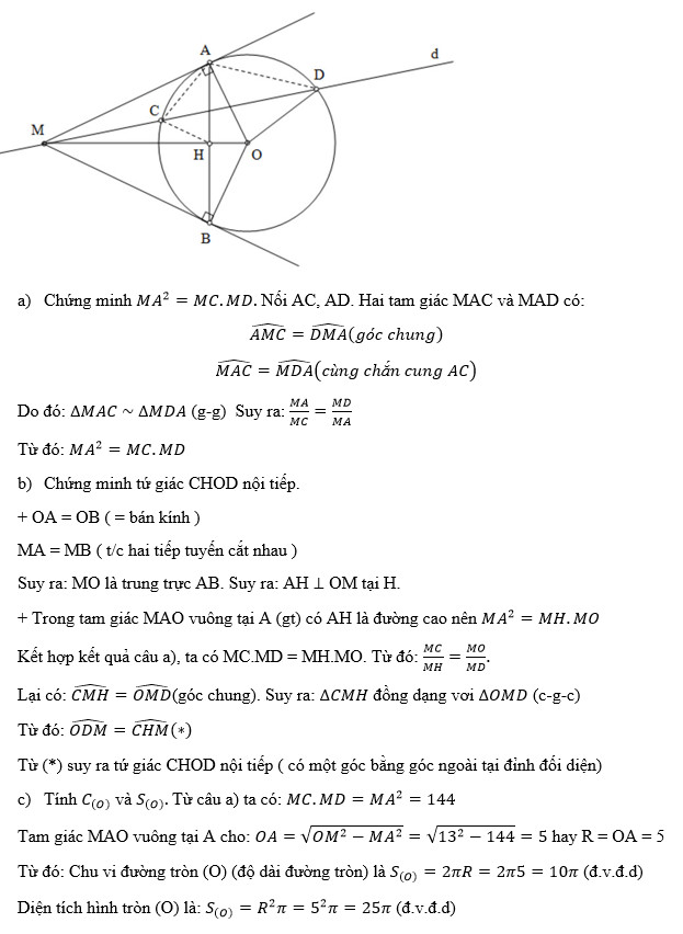 c) Cho MC.MD = 144 và OM = 13 (độ dài các đoạn thẳng đã cho có cùng đơn vị đo ). Tính độ dài đường tròn (O) và diện tích đường tròn (O).