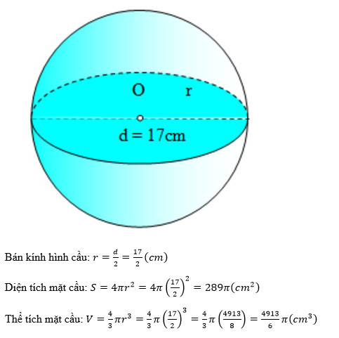 Một quả bóng World Cup xem như một hình cầu có đường kính là 17cm. Tính diện tích mặt cầu và thể tích hình cầu