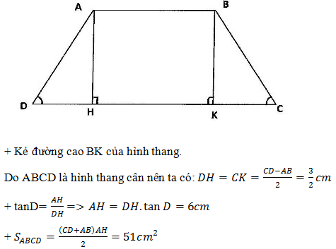 Cho hình thang cân ABCD có đáy lớn là CD, H là chân đường vuông góc hạ từ đỉnh A xuống cạnh CD. Biết AB = 7cm, CD = 10cm, tanD = 4. Tính diện tích của hình thang ABCD.