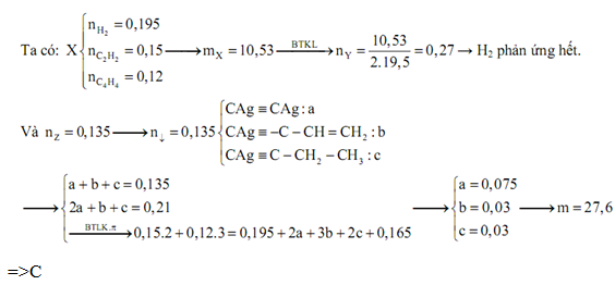 Một bình kín chứa hỗn hợp X gồm hiđro (0,195 mol), axetilen (0,15 mol), vinyl axetilen (0,12 mol) và một ít bột Ni. Nung nóng bình một thời gian, thu được hỗn hợp khí Y có tỉ khối hơi so với hidro bằng 19,5. Khí Y phản ứng vừa đủ với dung dịch chứa 0,21 mol AgNO3 trong NH3, thu được m gam kết tủa và 3,024 lít hỗn hợp khí Z (đktc). Khí Z phản ứng tối đa với 0,165 mol Br2 trong dung dịch. Giá trị của m là?