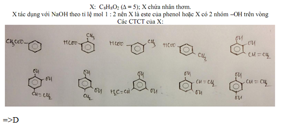 Hợp chất hữu cơ X có công thức phân tử C8H8O2, X chứa nhân thơm, khi cho 0,1 mol X tác dụng vừa đủ với dung dịch chứa 0,2 mol NaOH. Số đồng phân cấu tạo của X thỏa mãn là