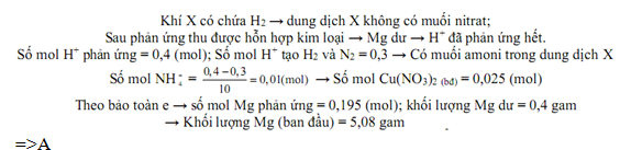 Hòa tan m gam Mg trong 500ml dung dịch chứa hỗn hợp H2SO4 0,4M và Cu(NO3)2 đến phản ứng hoàn toàn thu được dung dịch X; 2 gam hỗn hợp kim loại và hỗn hợp khí X gồm 0,03 mol H2 và 0,02 mol N2. Giá trị của m là