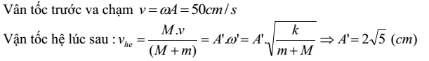Một con lắc lò xo nằm ngang gồm vật M có khối lượng 400 g và lò xo có độ cứng là 40 N/m đang dao động điều hòa trên mặt phẳng ngang nhẵn với biên độ 5cm. Đúng lúc M qua vị trí cân bằng người ta dùng vật m có khối lượng 100g bay với vận tốc 50 cm/s theo phương thẳng đứng hướng xuống bắn vào M và dính chặt ngay vào M. Sau đó M dao động với biên độ: