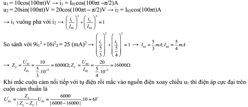 Đặt nguồn điện xoay chiều u1 = 10cos(100πt)V vào hai đầu cuộn cảm thuần L thì cường độ dòng điện tức thời chạy qua cuộn cảm là i1. Đặt nguồn điện xoay chiều u2 = 20sin(100πt)V vào hai đầu tụ điện C thì cường độ dòng điện tức thời chạy qua tụ điện là i1. Mối quan hệ về giá trị tức thời giữa cường độ dòng điện qua hai mạch trên là 9i12 +16i22 = 25(mA)2. Khi mắc cuộn cảm nối tiếp với tụ điện rồi mắc vào nguồn điện xoay chiều u1 thì điện áp cực đại trên cuộn cảm thuần là