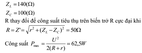 cos(100t)(V). Giá trị nào của R để công suất trên biến trở R là cực đại? Giá trị cực đại đó bằng bao nhiêu? Chọn kết quả đúng: