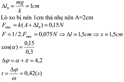 Một con lắc lò xo gồm lò xo có độ cứng k = 50 N/m và vật nặng có khối lượng m = 500 g treo thẳng đứng. Từ vị trí cân bằng, đưa vật dọc theo trục lò xo đến vị trí lò xo không biến dạng rồi buông nhẹ cho vật dao động điều hòa. Tính từ lúc buông vật, thời điểm đầu tiên lực đàn hồi của lò xo có độ lớn bằng nửa giá trị cực đại và đang giảm là:
