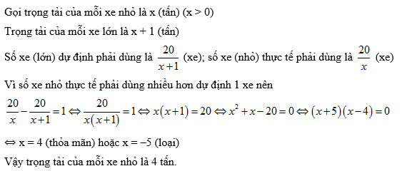 Một công ty vận tải dự định dùng loại xe lớn để chở 20 tấn rau theo một hợp đồng. Nhưng khi vào việc, công ty không còn xe lớn nên phải thay bằng những xe có trọng tải nhỏ hơn 1 tấn. Để đảm bảo thời gian đã hợp đồng, công ty phải dùng một số lượng xe nhiều hơn số xe dự định là 1 xe. Hỏi trọng tải của mỗi xe nhỏ là bao nhiêu tấn