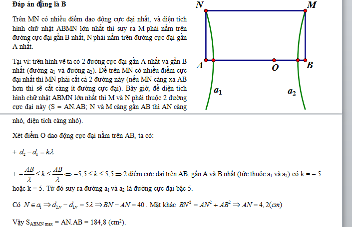 Trên mặt chất lỏng có hai nguồn phát sóng giống nhau A, B cách nhau 44 cm. M, N là hai điểm trên mặt nước sao cho ABMN là hình chữ nhật. Bước sóng của sóng trên mặt chất lỏng do hai nguồn phát ra là 8 cm. Khi trên MN có số điểm dao động với biên độ cực đại nhiều nhất thì diện tích hình nhữ nhật ABMN lớn nhất có thể là