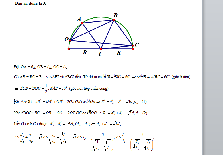Bốn điểm O, A, B, C cùng nằm trên một nửa đường tròn bán kính R sao cho AB = BC =R. Tại O đặt nguồn điểm phát sóng âm đẳng hướng ra không gian, coi môi trường không hấp thụ âm. Mức cường độ âm tại A là 24,05 (dB) và tại C là 18,03 (dB). Mức cường độ âm tại B xấp xỉ bằng