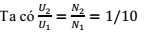 Một máy biến áp lý tưởng, cuộn sơ cấp có số vòng dây lớn hơn số vòng dây cuộn thứ cấp 10 lần.Chọn câu đúng