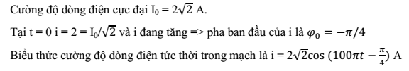 một dòng diện xoay chiều có tần số 50Hz và cường độ hiệu dụng 2A. Vào thời điểm t = 0, cường dộ dòng điện bằng 2A và đang tăng. Biểu thức của cường độ tức thời là:
