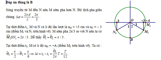 Hai điểm M, N cùng nằm trên một phương truyền sóng cách nhau λ/3, sóng có biên độ A, tại thời điểm t1 M và N có li độ lần lượt là uM = +3 cm và uN = –3 cm. Biết sóng truyền từ M đến N. Thời điểm t2 liền sau đó điểm M có li độ uM = +A. Khoảng thời gian