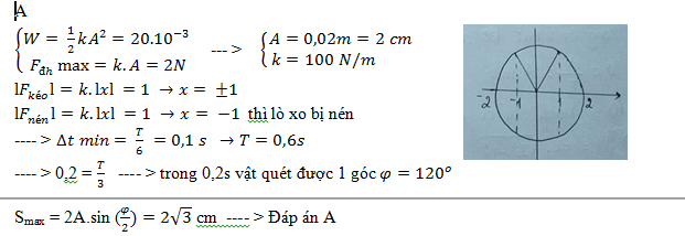 Một con lắc lò xo dao động điều hòa theo phương ngang với năng lượng dao động là 20mJ và lực đàn hồi cực đại là 2N. Gọi I là điểm cố định của lò xo. Khoảng thời gian ngắn nhất từ khi điểm I chịu tác dụng của lực kéo đến khi chịu tác dụng của lực nén có cùng độ lớn 1 N là 0,1s. Quãng đường lớn nhất mà vật đi được trong 0,2s là: