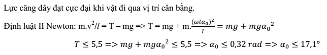 Một con lắc đơn treo vật nặng có khối lượng m =500g, dao động điều hòa với biên độ góc Lấy g = 10m/s2. Biết rằng dây treo chỉ chịu được lực căng lớn nhất là 5,5N. Để dây không đứt trong quá trình dao động thì góc không được vượt quá?