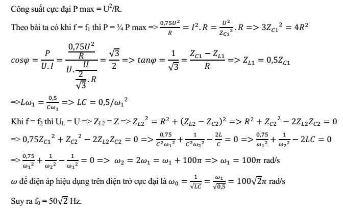 ft, trong đóng U có giá trị không đổi, f có thể thay đổi được. Khi f = f1 thì điện áp hiệu dụng trên tụ có giá trị bằng U, mạch tiêu thụ công suất bằng công suất cực đại. Khi tần số của dòng điện là f2 = f1 + 50Hz thì điện áp hiệu dụng trên cuộn cảm có giá trị bằng U. Tần số dòng điện khi điện áp hiệu dụng trên điện trở R đạt cực đại là