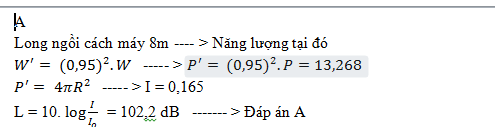 Nhà Long có một máy nghe nhạc (coi là nguồn điểm) có công suất 20W, biết trong quá trình truyền âm, cứ truyền được 1m thì năng lượng âm lại bị giảm đi 5% do sự hấp thụ của môi trường truyền âm. Biết Io = 10-12 W/m2. Long ngồi cách máy nghe nhạc 8m, hỏi nếu mở máy nghe nhạc to hết cỡ thì mức cường độ âm ở vị trí của Long gần giá trị nào nhất?