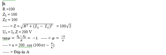 cos 100 (A). Hiệu điện thế hai đầu đoạn mạch có biểu thức: