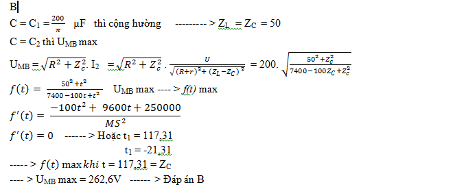 (µF) thì trong mạch xảy ra hiện tượng cộng hưởng. Điểu chỉnh C = C2 thì điện áp hiệu dụng của đoạn mạch MB đạt cực đại, giá trị cực đại đó xấp xỉ bằng: