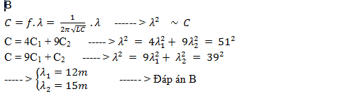 Một mạch dao động lý tưởng được dùng làm mạch chọn sóng của một máy thu vô tuyến điện. Điện dung của nó có giá trị thay đổi được, cuộn cảm có độ tự cảm không đổi. Nếu điều chỉnh điện dung C = 4 C1 + 9 C2 thì máy thu được bắt được sóng điện có bước sóng 51m. Nếu điều chỉnh điện dung C = 9 C1 + C2 thì máy thu bắt được sóng điện từ có bước sóng 39m. Nếu điều chỉnh điện dung của tụ lần lượt là C = C1 và C = C2 thì máy thu bắt được sóng điện từ có bước sóng theo thứ tự đó là: