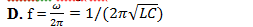 Một mạch dao động điện từ lí tưởng gồm cuộn cảm thuần có độ tự cảm L và tụ điện có điện dung C. Tần số dao động riêng của mạch là