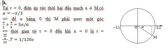 Một điện áp xoay chiều có biểu thức . Điện áp có giá trị bằng 0 lần đầu tiên tại thời
