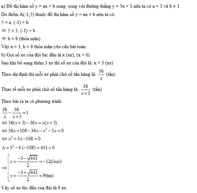 b) Một đội xe phải chuyên chờ 36 tấn hàng. Trước khi làm việc, đội xe đó được bổ sung thêm 3 xe nữa nên mỗi xe chở ít hơn 1 tấn so với dự định. Hỏi đội xe lúc đầu có bao nhiêu xe? Biết rằng số hàng chở trên tất cả các xe có khối lượng bằng nhau