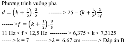 Trong hiện tượng truyền sóng cơ với tốc độ truyền sóng là 80 cm/s, tần số dao động có giá trị từ 11 Hz đến 12,5 Hz. Hai điểm trên phương truyền sóng cách nhau 25 cm luôn dao động vuông pha. Bước sóng là