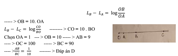 Cho 4 điểm O, A, B, C theo thứ tự đó cùng nằm trên một đường thẳng. Tại O đặt một nguồn âm điểm phát sóng đẳng hướng. Mức cường độ âm tại A lớn hơn mức cường độ âm tại B là 20dB, mức cường độ âm tại B lớn hơn mức cường độ âm tại C là 20dB. Tỉ số AB/BC là: