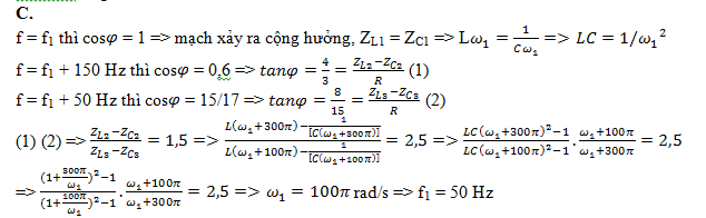 Đặt điện áp (trong đó U0 không đổi và f thay đổi được) vào hai đầu đoạn mạch RLC mắc nối tiếp. Khi tần số là f = f1, f = f1 + 150 Hz, f = f1 + 50 Hz thì hệ số công suất của mạch tương ứng là 1; 0,6 và 15/17. Tần số để mạch xảy ra cộng hưởng có thể là