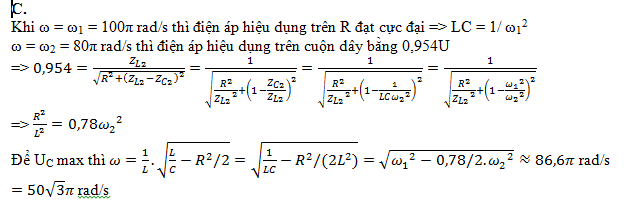 ( ω thay đổi được) vào hai đầu đoạn mạch AB nối tiếp gồm điện trở thuần R, cuộn dây thuần cảm có độ tự cảm L và tụ điện có điện dung C . Khi ω=100π rad/s thì điện áp hiệu dụng trên R đạt cực đại. Khi ω= 80π rad/s thì điện áp hiệu dụng trên cuộn dây bằng 0,954U. Để điện áp trên tụ điện có giá trị cực đại thì tần số góc ω có giá trị gần đúng bằng