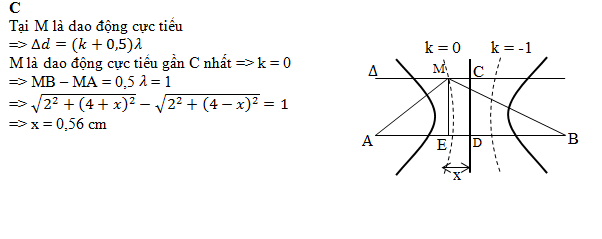 Trong thí nghiệm giao thoa trên mặt nước, hai nguồn sóng kết hợp A và B dao động cùng pha, cùng tần số, cách nhau AB = 8cm tạo ra hai sóng kết hợp có bước sóng λ = 2cm. Trên đường thẳng (∆) song song với AB và cách AB một khoảng là 2cm, khoảng cách ngắn nhất từ giao điểm C của (∆) với đường trung trực của AB đến điểm M trên đường thẳng (∆) dao động với biên độ cực tiểu là